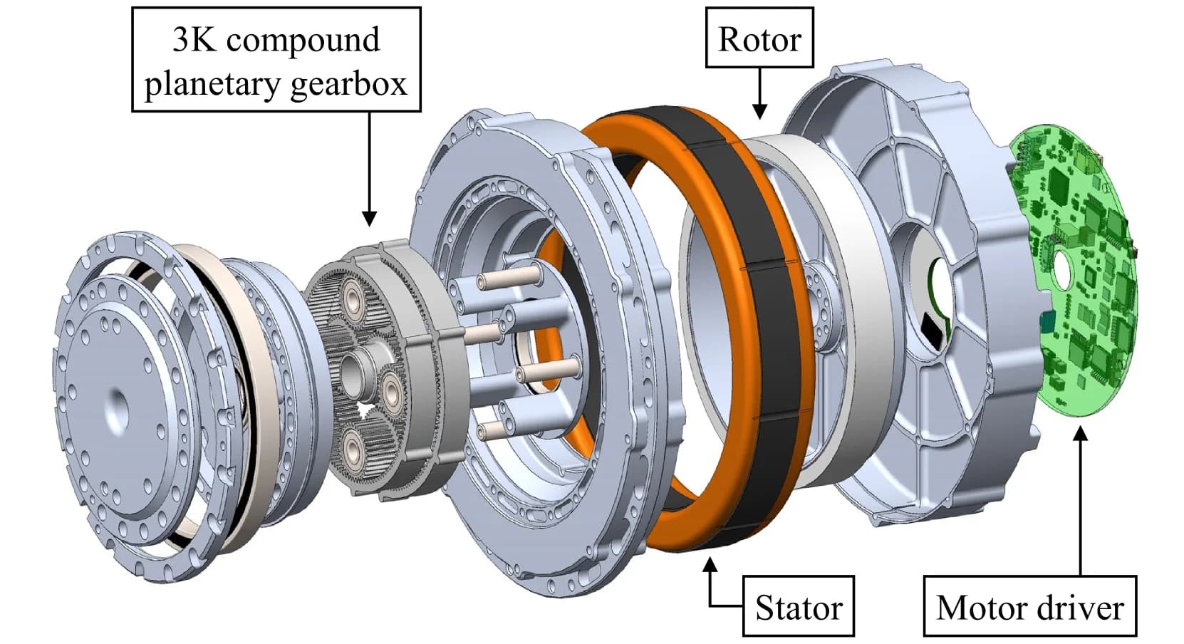 The standout innovation is the custom 3K compound planetary gearbox (CPG). While traditional planetary systems often require multiple stages to achieve high gear ratios—increasing volume and weight—the 3K CPG provides high reduction within a compact, single-stage volume by using two sets of ring gears with slightly different tooth counts.